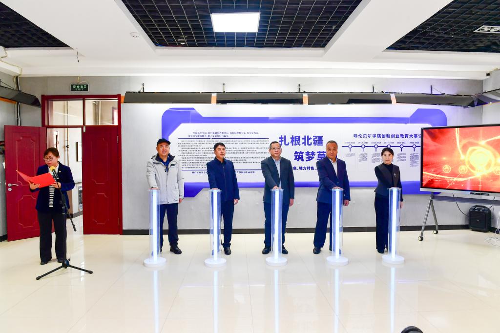 近日,我校“专创融合成果展”在校史馆二楼展厅启幕。校党委副书记、校长张玉柱,校党委委员、副校长李跃武、张桂芝,呼伦贝尔市人力资源和社会保障局副局长黄义喜,海拉尔区人力资源和社会保障局局长丁永,以及学校各部门、各学院领导老师参加启动仪式。