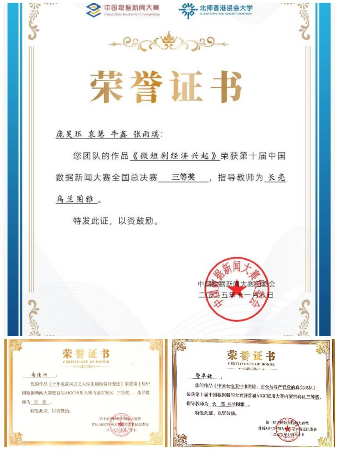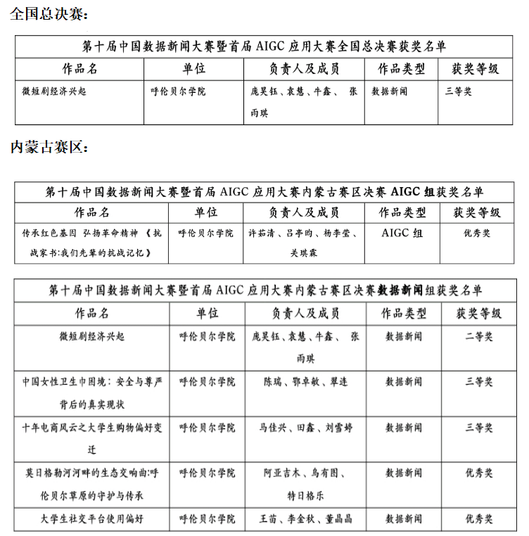 全国总决赛中,文学院庞昊珏、袁慧、牛鑫、张雨琪四名同学的作品《微短剧经济的兴起》,以严谨数据、新颖呈现与深刻洞察获评全国三等奖。内蒙古赛区评选中,我校学子同样亮眼:数据新闻作品获二等奖1项、三等奖2项、优秀奖2项,AIGC应用作品获优秀奖1项,全方位展现了新闻学专业在数字内容创作领域的综合实力与育人质量。