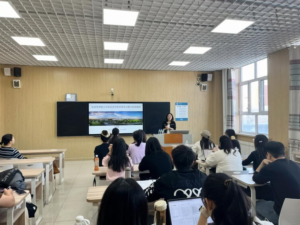 为助力研究生突破毕业论文写作难点、明确开题报告优化方向、提升学术研究与论文撰写能力,12月6日上午,旅游地理与历史文化学院邀请上海师范大学硕士生导师王朋薇副教授开展题为“旅游管理硕士毕业论文写作的常见问题与优化路径”的专题讲座。讲座由学院副院长徐舒静主持,旅游管理专业硕士点负责人亚吉、MTA导师梅荣、研究生办公室呼斯楞老师以及2024级、2025级旅游管理硕士研究生聆听讲座。