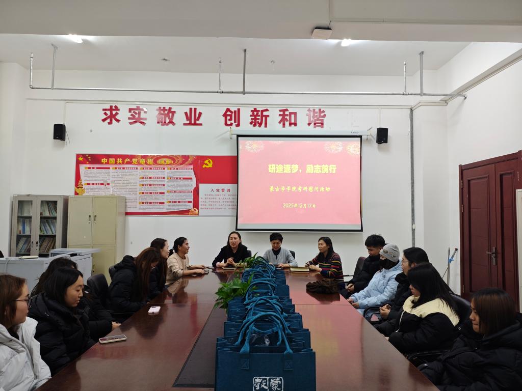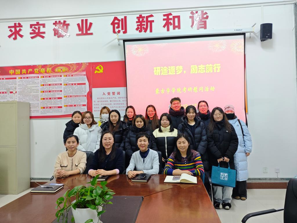 为助力考研学子坚定备考信心、舒缓备考压力,营造积极温暖的迎考氛围,12月17日下午,蒙古学学院在崇文楼B211会议室组织开展了“研途逐梦,励志前行”考研慰问活动。学院领导班子成员、辅导员及13名考研学子参加,活动由学院党委副书记孔春艳主持。