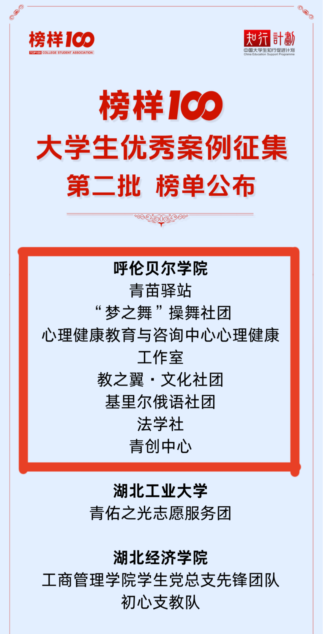 近日,由中国大学生知行促进计划与青年影响力创新中心联合发起的2025年度“榜样100”全国优秀大学生社团及团队征集活动榜单正式揭晓。我校青苗驿站、“梦之舞”操舞社团、心理健康教育与咨询中心心理健康工作室、教之翼·文化社团、基里尔俄语社团、法学社、青创中心等7个学生社团荣登榜单。