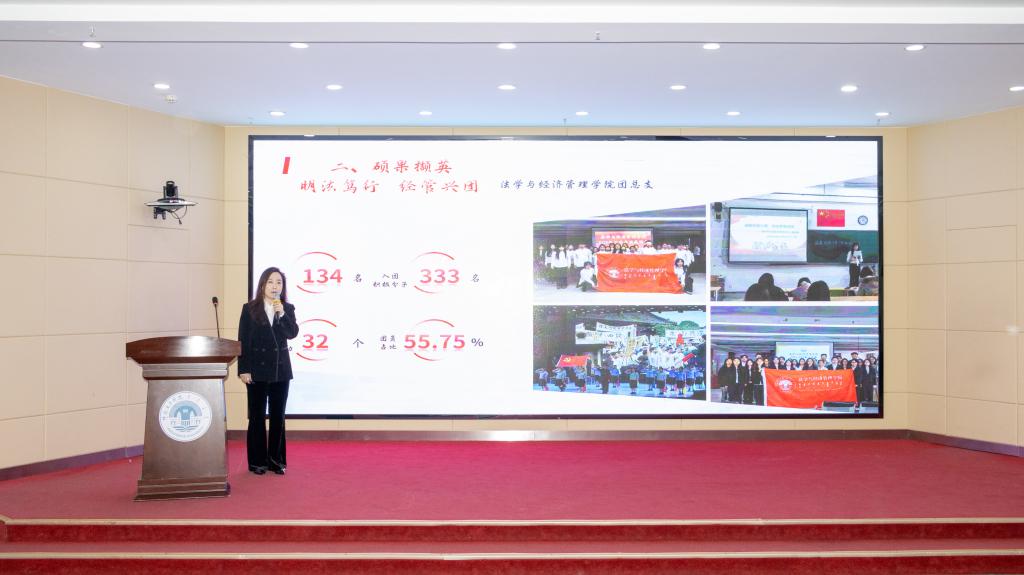 评议会上,各学院团总支书记根据抽签顺序依次进行述职,全面系统的总结2025年度各团总支工作开展情况,一组组数据图表、一张张实践照片,立体呈现了我校共青团蓬勃向上的青春风采。经评选,法学与经济管理学院团总支书记赵婷取得述职评议环节第一名。