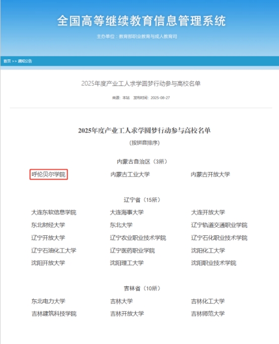 近日,教育部职业教育与成人教育司公布“2025年度产业工人求学圆梦行动参与高校名单”,我校凭借在矿山安全生产培训、矿山、化工企业工人专业技能培训及采矿、化工、机电专业专升本学历继续教育领域的深厚积淀与扎实成效,成功跻身全国292所入选高校之列,成为内蒙古自治区3所获此殊荣的院校之一。