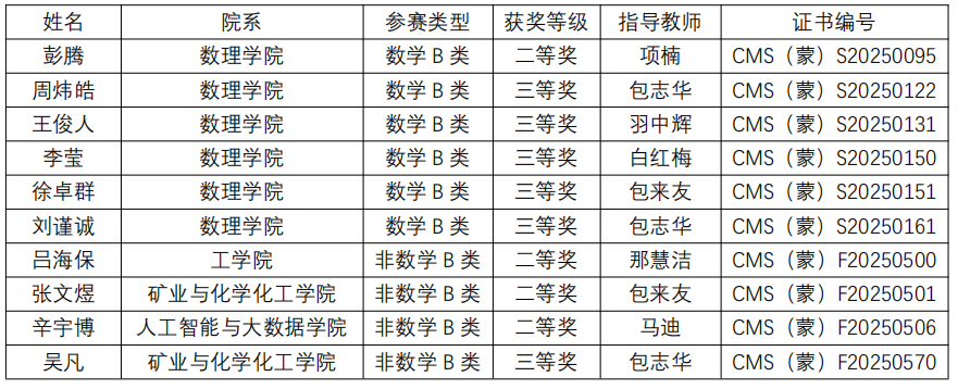 2025年12月24日,中国数学会公布了第十七届全国大学生数学竞赛各赛区成绩。我校学子在竞争激烈的内蒙古赛区比赛中荣获多项奖励,展现了我校扎实的数学教学功底与学生出色的学习能力。