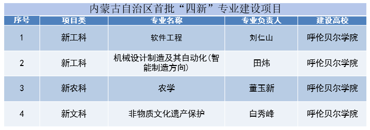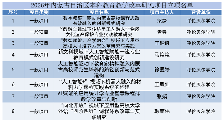 近日,内蒙古自治区教育厅印发《关于公布首批“四新”专业建设项目立项结果的通知》(内教高函〔2025〕95号)《关于公布2026年内蒙古自治区本科教育教学改革研究项目立项名单的通知》(内教高函〔2025〕91号),我校成果丰硕,共有4个项目获批首批自治区“四新”专业建设项目,8个项目获批2026年自治区本科教育教学改革研究项目。