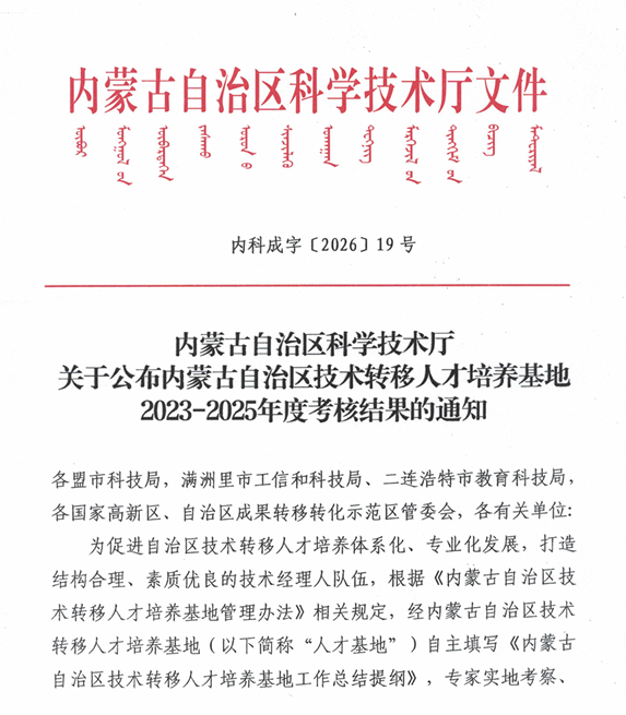 4月15日,内蒙古自治区科学技术厅公布《内蒙古自治区技术转移人才培养基地2023—2025年度考核结果》,我校自治区技术转移人才培养基地顺利通过周期考核,获评合格等次,其在技术转移人才培养、科技成果转化服务等方面的成效与规范运行水平得到肯定。