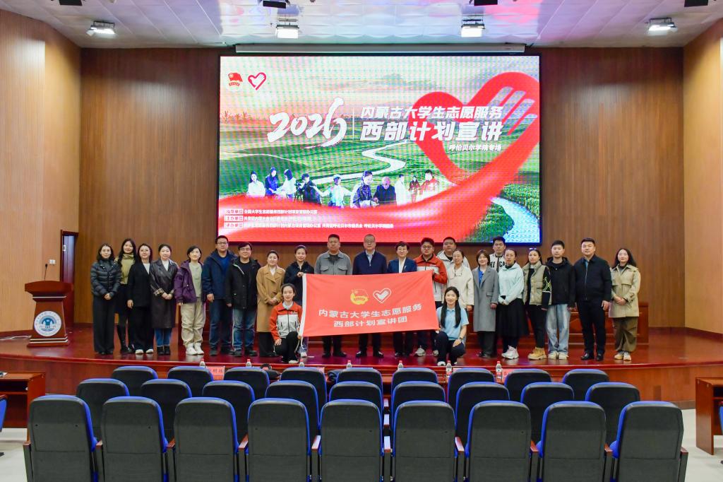 为深入解读大学生志愿服务西部计划相关政策,广泛动员青年学生投身基层、服务西部,助力乡村振兴,4月16日晚,我校在图书馆四楼报告厅举办2026年内蒙古大学生志愿服务西部计划宣讲会。宣讲会邀请内蒙古自治区团委机关团委书记、西部计划自治区项目办负责人、内蒙古青年志愿者协会秘书长李广义,内蒙古自治区西部计划项目办宣讲志愿者付苏婷、袁蕴涵、王逗、刘璇进行宣讲。校党委副书记张宏天,共青团呼伦贝尔市委员会副书记博慧,共青团呼伦贝尔市委员会志工部干部吕姝欣出席宣讲会。校团委全体人员、各二级学院党委副书记、团总支书记、毕业班辅导员和大三、大四学生代表参加本次宣讲会。