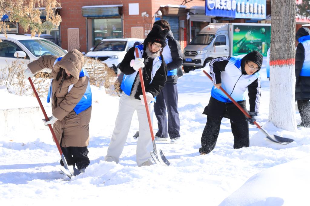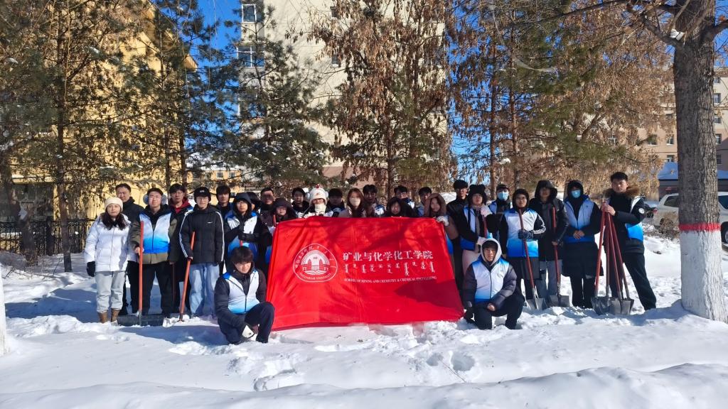 活动现场,师生志愿者们热情高涨、分工协作,不畏寒冷、干劲十足。大家手持铁锹、推雪板等工具,对包联区域人行道、出入口等处的积雪与结冰进行集中清理。面对压实的冰雪,志愿者们齐心协力、铲扫结合,重点清除路面隐患区域,确保道路畅通、居民出行安全。蓝白相间的志愿马甲在白雪映衬下格外醒目,充分展现了矿化学院师生不怕苦、不怕累、团结协作的优良作风。